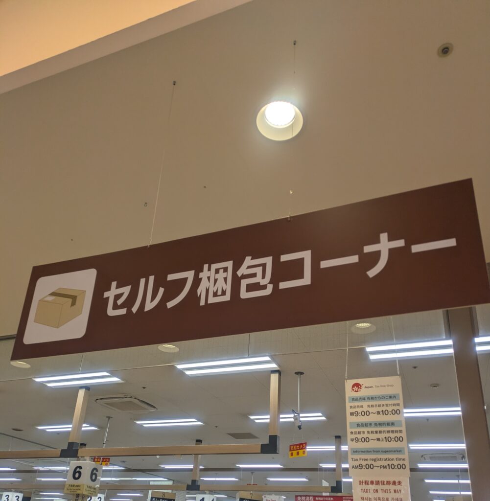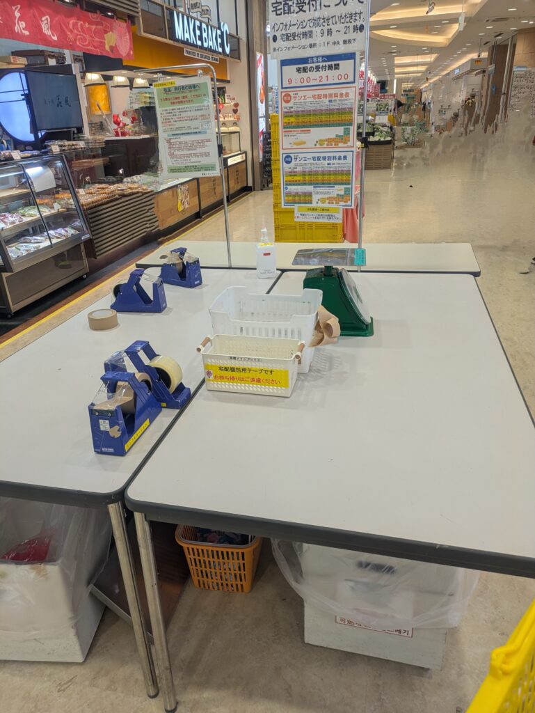 そこで箱詰め作業をせっせとしたらフロア内に宅配カウンターがありますのでそちらで送り先の記入やお金を払えば帰りは手ぶらです