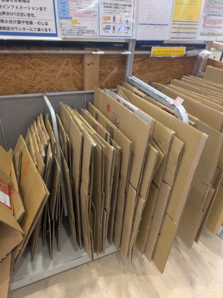 梱包用の段ボールやテープはフロアに置いてあり無料で利用できる(レジ横に梱包スペース)